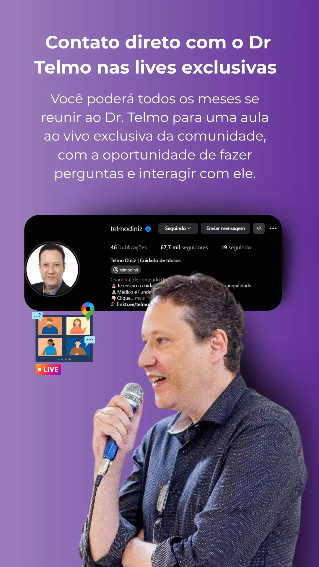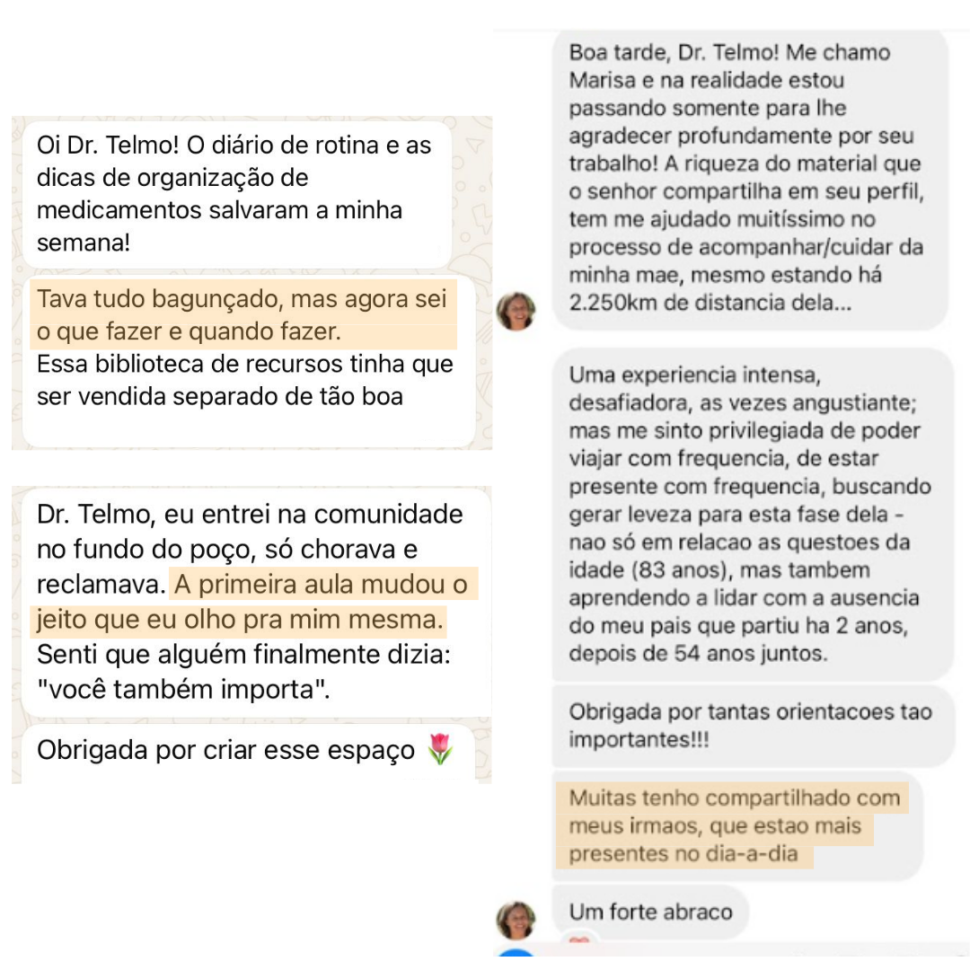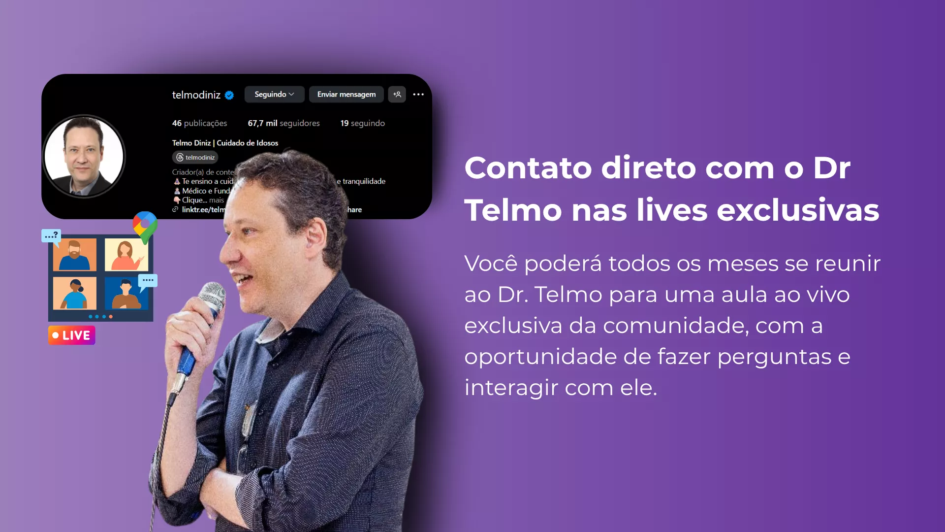 O conteúdo dentro da comunidade foi desenvolvido pelo Dr. Telmo, médico com quase 30 anos de experiência com idosos . Ele já ajudou milhares de famílias a lidarem com os desafios do envelhecimento com mais leveza e resultado.